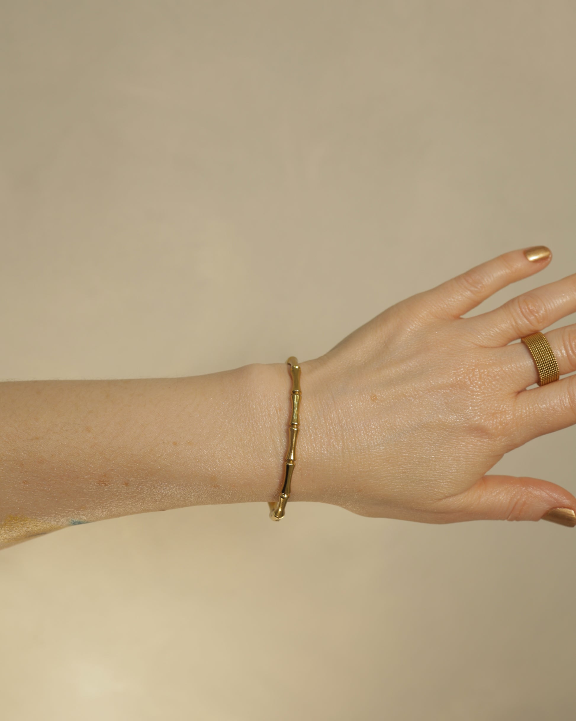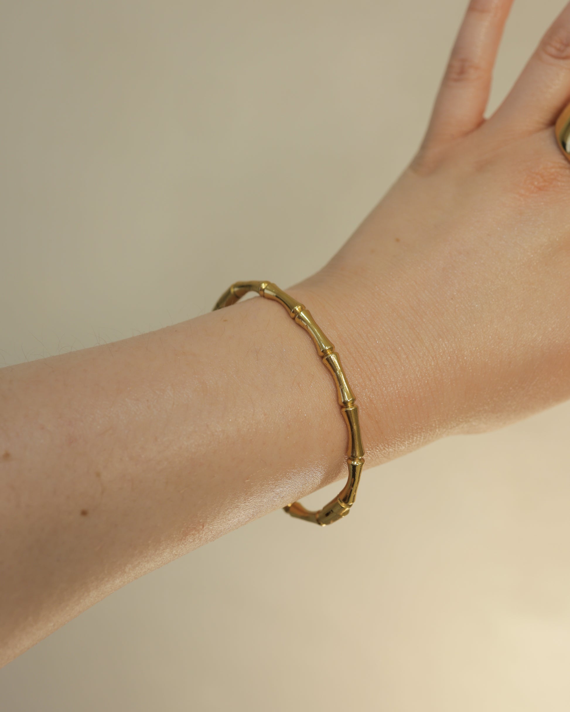 For the bold soul who wears strength with grace: this non‑tarnish stainless steel bamboo bangle is more than an accessory, it’s an emblem. Its geometric, bamboo‑inspired design and radiant 18K gold plating make it a standout piece, perfect for layering or as a statement on its own. Crafted for those who dare to be different, this bracelet is a tribute to the fearless spirit that refuses to blend in.