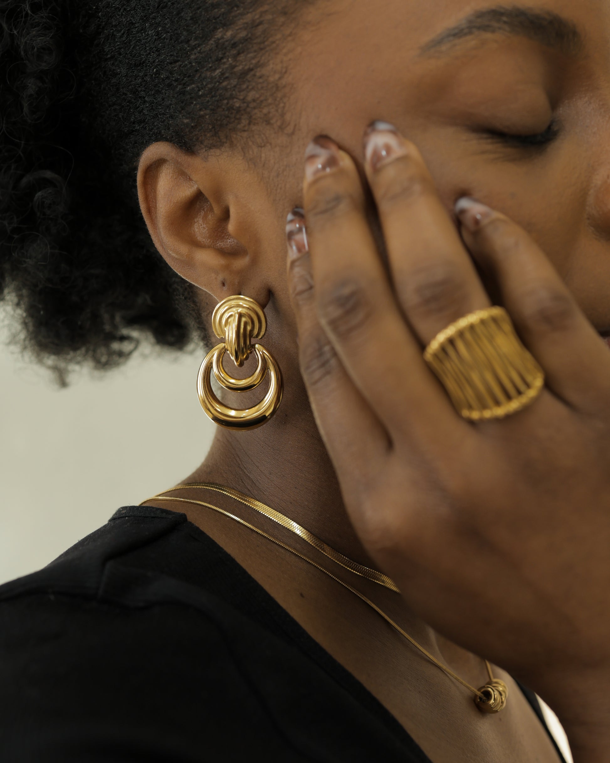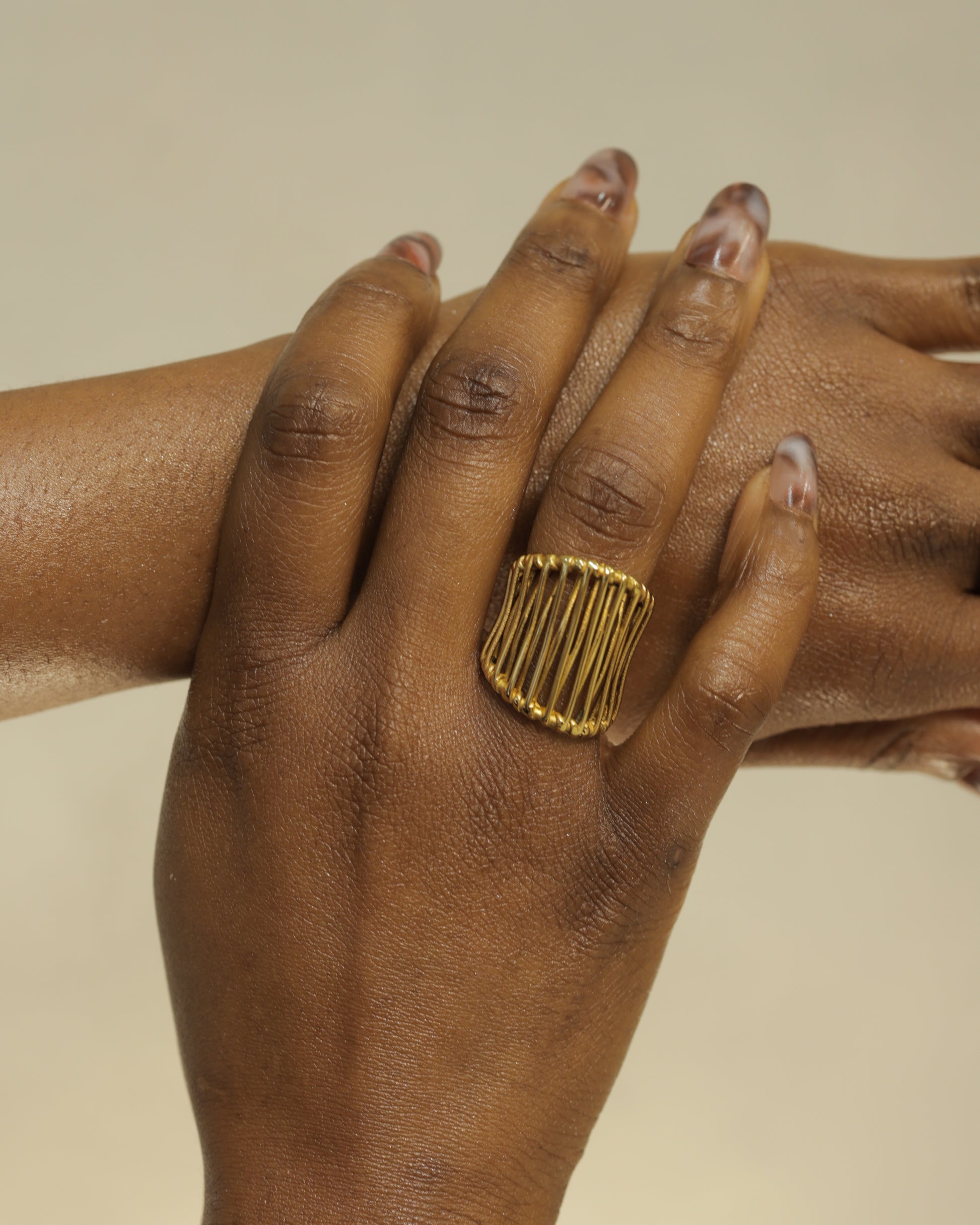 For those who live loud and light: this hollow-out, statement stainless steel ring plated in 18K gold is no whisper, it’s your anthem. Its geometric silhouette and high-impact presence demand attention, turning every hand gesture into a declaration. Bold souls wear bold pieces ,let this ring be your reminder.
